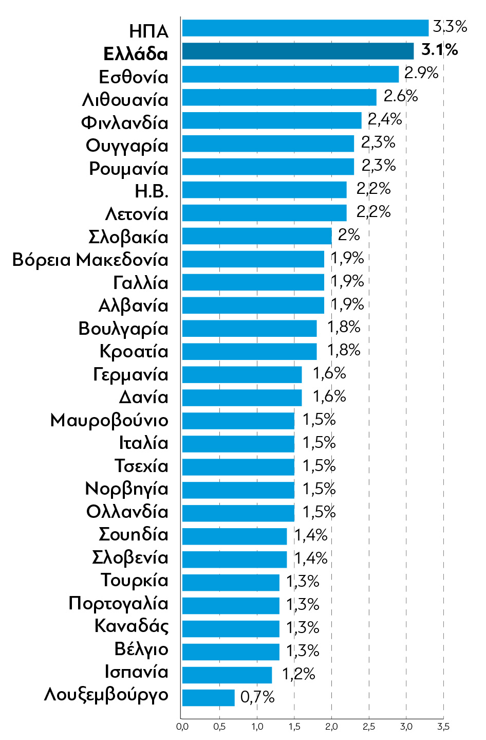 Ο κανονισμός του ΝΑΤΟ ζητά από τα κράτη-μέλη να δαπανούν το 2% του ετήσιου προϋπολογισμού τους για τις ένοπλες δυνάμεις. Είκοσι από τα 31 κράτη-μέλη δαπάνησαν λιγότερα το 2023, ανάμεσά τους η Γαλλία, η Γερμανία, η Ισπανία και η Ιταλία. Η Ελλάδα βρίσκεται στην τρίτη θέση με 3,1%, οι ΗΠΑ στη δεύτερη με 3,3% και η Πολωνία στην πρώτη με 4,3%.