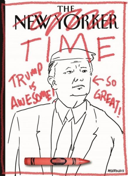 Ο Μαυρουδής σκίτσαρε τον Τραμπ γράφοντας δίπλα του: «Είναι φοβερός» και «Είναι υπέροχος», ενώ είχε σβήσει το τίτλο «New Yorker», γράφοντας «TIME».