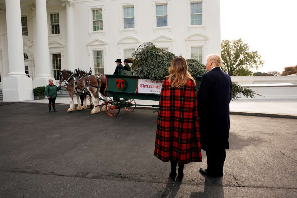 Ο αμερικανός Πρόεδρος και η Πρώτη Κυρία παρέλαβαν το χριστουγεννιάτικο δέντρο, που έφτασε πάνω σε άμαξα. Ο Ντόναλντ Τραμπ βγήκε από τον Λευκό Οίκο κρατώντας από το χέρι την Μελάνια Τραμπ, η οποία φορούσε μια κόκκινη καρό κάπα, ανάλογη της περίστασης.