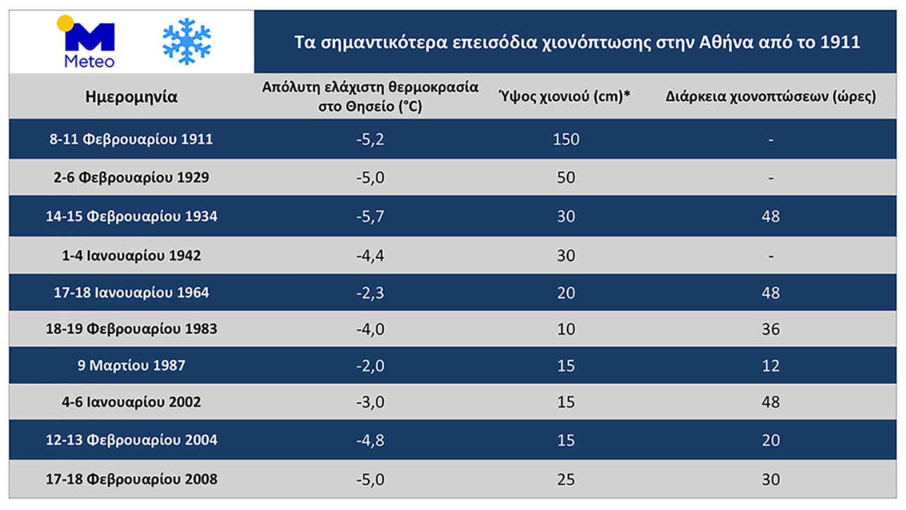 Καθώς η «Μήδεια» μπορεί να φέρει χιόνια ακόμη και στην Αθήνα, το meteo.gr υπενθυμίζει τα σημαντικότερα επεισόδια χιονόπτωσης στην πρωτεύουσα εδώ και πάνω από έναν αιώνα.