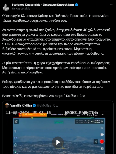 Ακολούθησε μία ακόμη ανάρτηση από τον κ. Κασσελάκη με αίτημα, ξανά, την αποπομπή Κικίλια –ο οποίος αρχικά αναφέρθηκε λανθασμένα ως «υπουργός Προστασίας του Πολίτη»– με αφορμή επιχειρησιακά πλάνα που κοινοποίησε προς επίρρωση όσων είχε υποστηρίξει νωρίτερα περί «ταχύτατης επιχειρησιακής απόκρισης» στο ξέσπασμα της καταστροφικής φωτιάς.