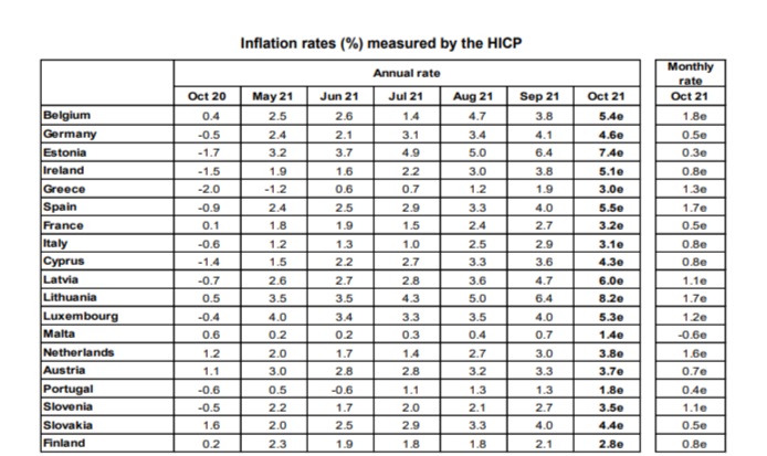Ανεξάρτητα λοιπόν από τις αιτίες και από τις εκτιμήσεις περί προσωρινότητας της κατάστασης, το πρόβλημα παραμένει. Στην Ευρωζώνη ο πληθωρισμός ανήλθε στο 3,4% τον Σεπτέμβριο (από 3% τον Αύγουστο) και προβλέπεται να αυξηθεί στο 4,1% τον Οκτώβριο, σύμφωνα με όσα ανακοίνωσε η Eurostat την Παρασκευή. Υπάρχουν χώρες με ήδη σοβαρά ζητήματα: στη Γερμανία ανήλθε στο 4,6% (ρεκόρ 28 ετών) και στην Ισπανία έφτασε το 5,5% (ρεκόρ 37 ετών!). Για την Ελλάδα η εκτίμηση της Eurostat είναι πληθωρισμός 3% τον Οκτώβριο (από 1,9% τον Σεπτέμβριο).