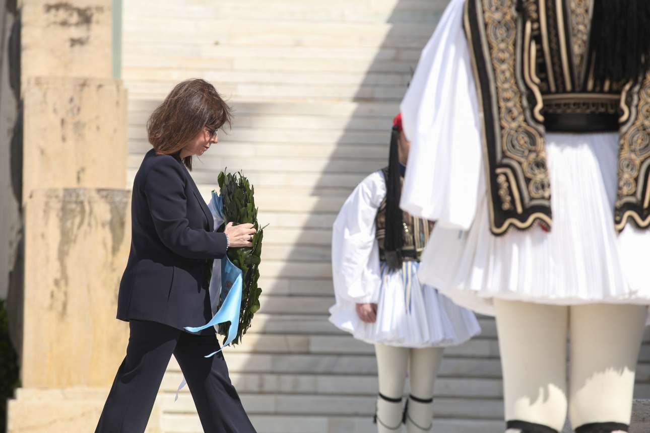 Η Πρόεδρος της Δημοκρατίας Κατερίνα Σακελλαροπούλου, στα 4,5 λεπτά παραμονής της στον Αγνωστο Στρατιώτη, όπως ανέφερε το ΑΠΕ, κατέθεσε στεφάνι στο μνημείο και ευχήθηκε «χρόνια πολλά» στην πολιτική ηγεσία του τόπου και τους άλλους παρευρισκόμενους.
