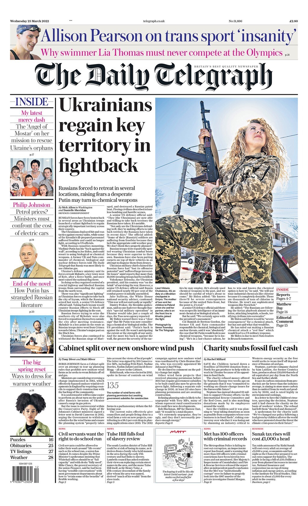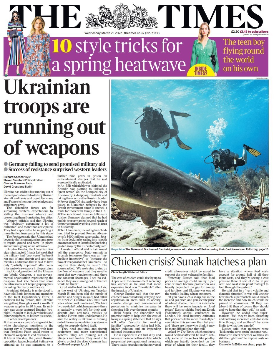 Η Daily Telegraph γράφει ότι οι Ουκρανοί ανέκτησαν περιοχή-κλειδί καθώς αντεπιτίθενται επιτυχώς. Η εφημερίδα επισημαίνει ότι η ανάκτηση μιας πόλης δυτικά του Κιέβου επιβεβαιώνει το πόσο κακά προετοιμασμένη ήταν η ρωσική εκστρατεία.