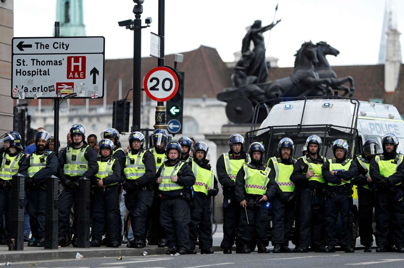 Ανθρωποι που φορούσαν φανέλες ποδοσφαιρικών ομάδων, φώναζαν «Αγγλία, Αγγλία» και αυτοχαρακτηριζόμενοι ως πατριώτες, είχαν συγκεντρωθεί πλάι σε βετεράνους του στρατού για να προστατεύσουν το μνημείο του Κενοταφίου, σε μικρή απόσταση από την Τραφάλγκαρ.