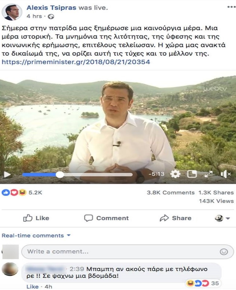 Στη live μετάδοση του διαγγέλματος του Πρωθυπουργού μέσω Facebook γινόταν ο «κακός χαμός». Δεκάδες χρήστες βρήκαν την ευκαιρία να… εκφράσουν την δική τους άποψη για την έξοδο της χώρας από τα μνημονιακά δεσμά, ενώ όσο συνεχιζόταν η πρωθυπουργική δήλωση, τα σχόλια και οι αντιδράσεις πλήθαιναν με εντυπωσιακό ρυθμό.