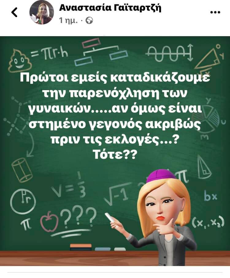 Η κυρία Γαϊταρτζή αναρωτήθηκε κι εκείνη σε post της αν η όλη υπόθεση σχετίζεται με τις προσεχείς εκλογές, ταυτιζόμενη με επιχείρημα που εξέφρασε ο ίδιος ο Αλέξης Γεωργούλης αρχικά, ενώ ο κ. Μίγας έκανε ανάρτηση «που υιοθετούσε κουτσομπολιά» (!), όπως το έθεσε η κομματική «Αυγή», με υβριστικό περιεχόμενο σε βάρος του φερόμενου θύματος βιασμού –στη δική του περίπτωση υιοθετήθηκε το μέτρο της διαγραφής του.