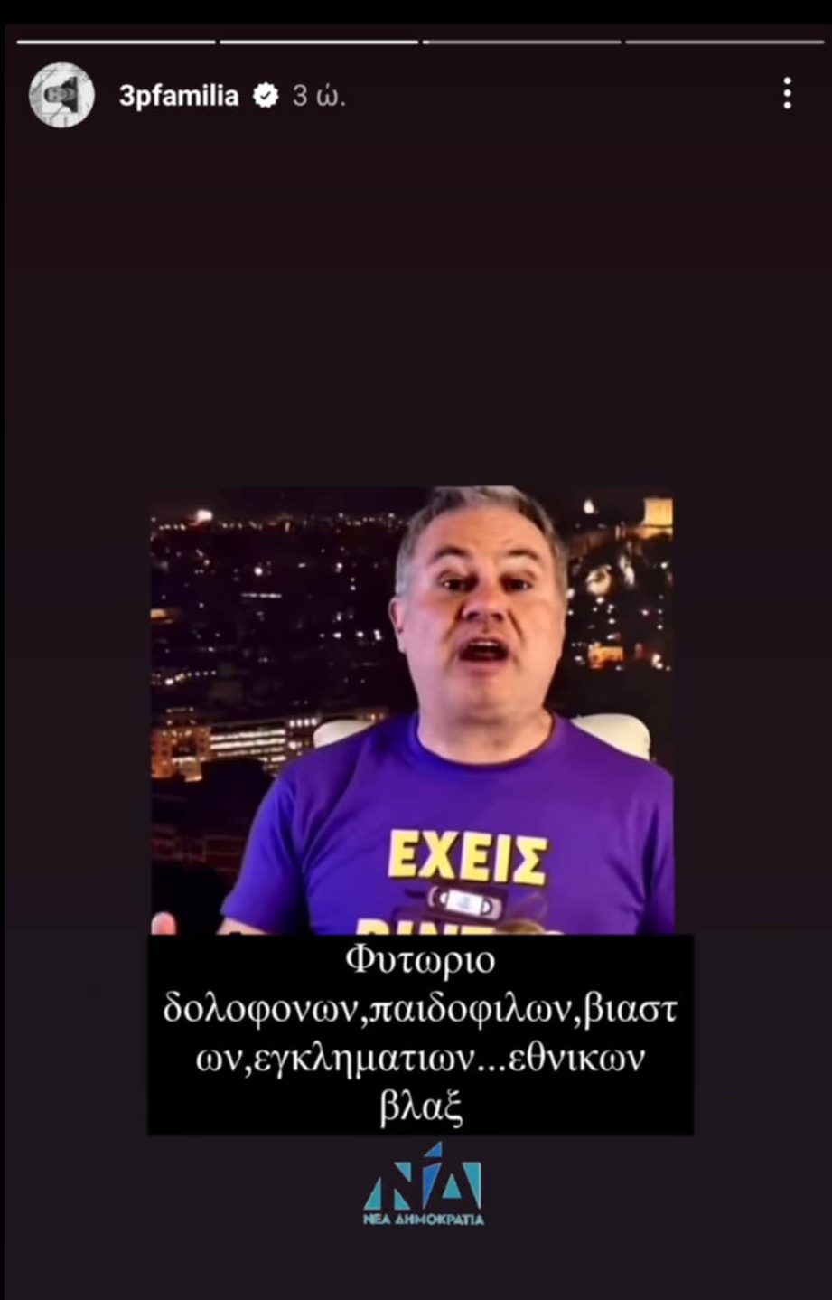 Λίγες ώρες νωρίτερα, ο πρώην καλαθοσφαιριστής και νυν ευρωβουλευτής του ΣΥΡΙΖΑ δημοσίευσε στο Instagram ένα απόσπασμα από βίντεο του κωμικού Χριστόφορου Ζαραλίκου κάτω από το οποίο είχε προστεθεί η λεζάντα «φυτώριο δολοφόνων, παιδόφιλων, βιαστών, εγκληματιών, εθνικών βλαξ» αλλά και το σήμα της Νέας Δημοκρατίας. Λίγο αργότερα, ο ευρωβουλευτής διέγραψε την συγκεκριμένα ανάρτηση (story) και ανέβασε ξανά το απόσπασμα του βίντεο χωρίς όμως την αισχρή λεζάντα.