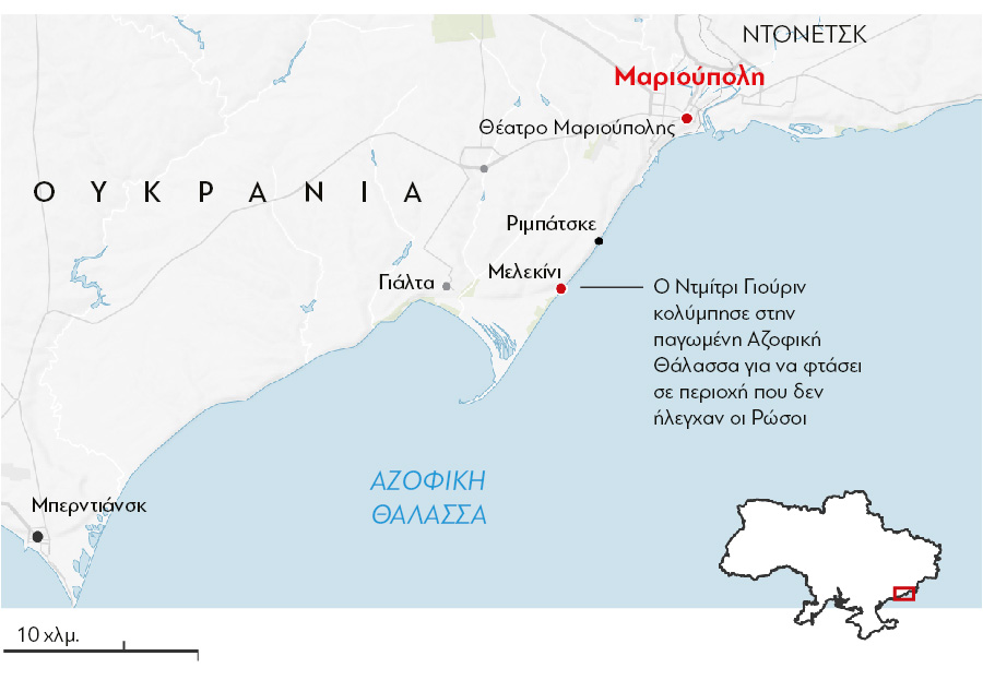 Ο Γιούριν επέστρεψε σπίτι του σοκαρισμένος και αποφάσισε ότι πρέπει να φύγει από την πόλη για να σωθεί. Οι Ρώσοι την πολιορκούσαν ήδη για δύο εβδομάδες. Η Μαριούπολη ήταν αποκομμένη από παντού. Ο μόνος δρόμος διαφυγής, σκέφτηκε ο Γιούριν, ήταν η θάλασσα. Ετσι, αποφάσισε να κολυμπήσει στα παγωμένα νερά της Αζοφικής Θάλασσας, μέσα στο σκοτάδι.
