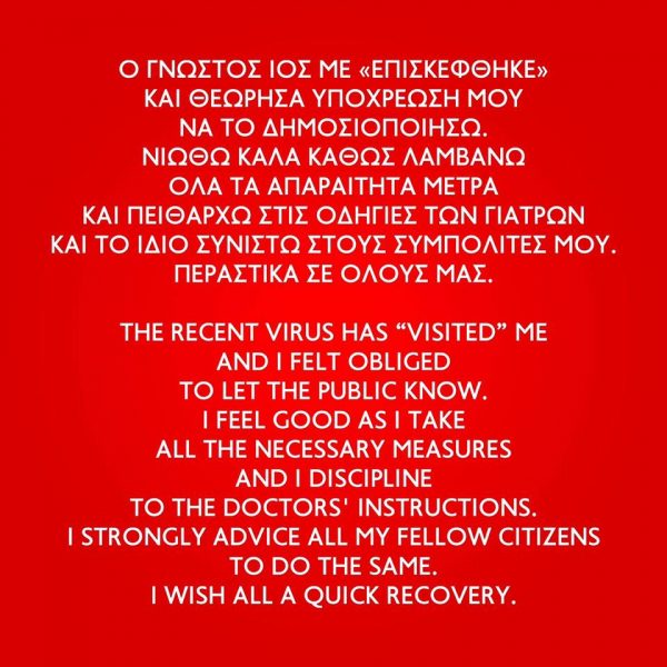 Το γεγονός ότι προσεβλήθη από τον κορονοϊό –τον οποίο ο ίδιος χαρακτηρίζει ως «γνωστό ιό»– γνωστοποίησε την Τρίτη το μεσημέρι ο Βαγγέλης Μαρινάκης.