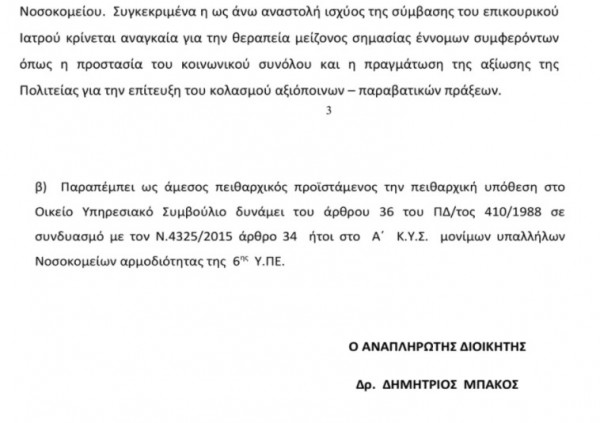Στην εισήγηση, ωστόσο, να λυθεί η σύμβασή του για σοβαρό λόγο, και μάλιστα αζημίως, η απόφαση του διοικητικού συμβουλίου του νοσοκομείου ήταν αρνητική, με αποτέλεσμα ο εν λόγω παιδίατρος να παραμείνει στη θέση του επί δύο χρόνια.