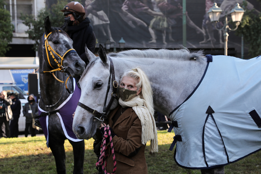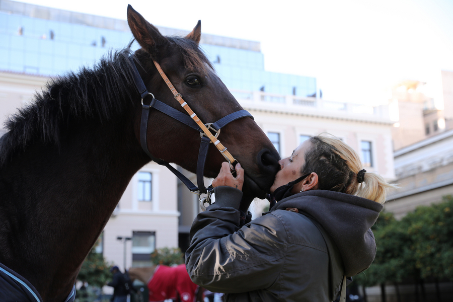 Εφιππη συγκέντρωση διαμαρτυρίας στο κέντρο της Αθήνας, στο άγαλμα του Κολοκοτρώνη, μπροστά από το κτίριο της Παλιάς Βουλής, πραγματοποίησαν εργαζόμενοι στον Ιππόδρομο, ζητώντας να μην κλείσει το ιπποδρόμιο στο Μαρκόπουλο.
