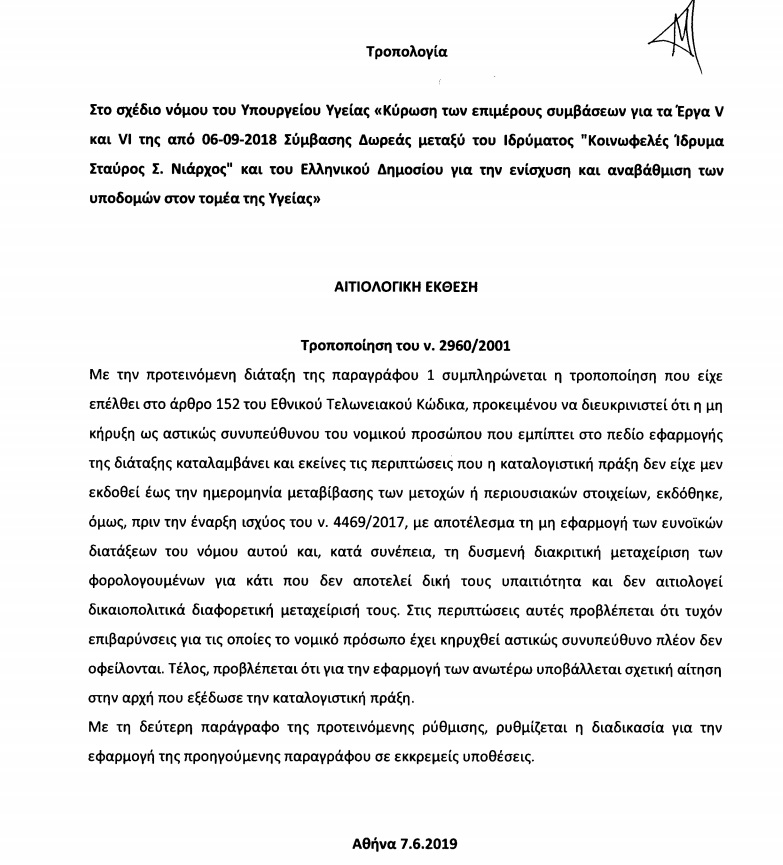 Η τροπολογία ουσιαστικά συμπληρώνει περαιτέρω τον νόμο 4469/2017 αναφέροντας ότι «καταλογιστικές πράξεις που εκδόθηκαν μετά την ημερομηνία μεταβίβασης των μετοχών ή περιουσιακών στοιχείων και αφορούν προγενέστερες της μεταβίβασης περιόδους, δεν εκτελούνται και ανακαλούνται υποχρεωτικά κατά το μέρος που αφορούν το νομικό πρόσωπο ως αστικώς συνυπεύθυνο, του οποίου οι οφειλές από πρόστιμα, πολλαπλά τέλη, δασμούς και λοιπές επιβαρύνσεις, που προέρχονται αποκλειστικά από τις ανωτέρω καταλογιστικές πράξεις, διαγράφονται».