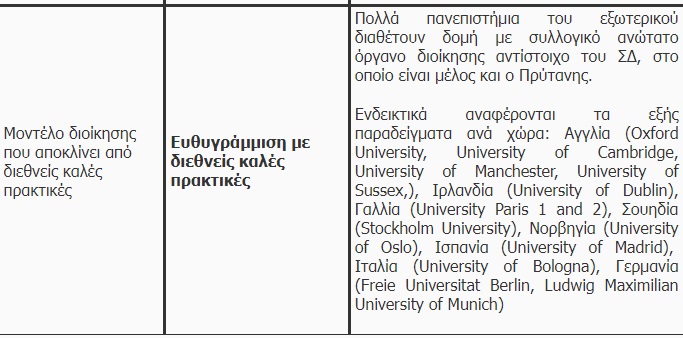 Το προτεινόμενο μοντέλο διοίκησης ευθυγραμμίζει το πανεπιστημιακό μοντέλο διοίκησης με διεθνείς καλές πρακτικές, καθώς πολλά πανεπιστήμια του εξωτερικού διαθέτουν δομή συλλογικό ανώτατο όργανο διοίκησης αντίστοιχο του ΣΔ, στο οποίο είναι μέλος και ο Πρύτανης. Ενδεικτικά αναφέρονται τα εξής παραδείγματα ανά χώρα: Αγγλία (Oxford University, University of Cambridge, University of Manchester, University of Sussex,), Ιρλανδία (University of Dublin), Γαλλία (University Paris 1 and 2), Σουηδία (Stockholm University), Νορβηγία (University of Oslo), Ισπανία (University of Madrid), Ιταλία (University of Bologna), Γερμανία (Freie Universitat Berlin, Ludwig Maximilian University of Munich).