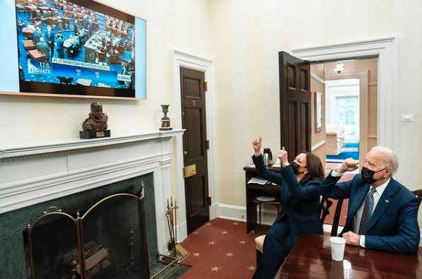 Ο Τζο Μπάιντεν και η Κάμαλα Χάρις γιόρτασαν την ψήφιση του νομοσχεδίου με υψωμένες γροθιές και παραχώρησαν συνέντευξη Τύπου στον Λευκό Οίκο.