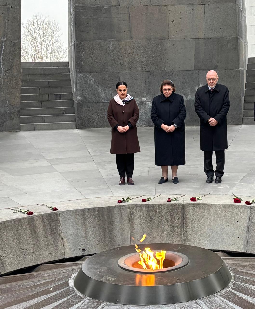 Στη συνέχεια η κυρία Μενδώνη ξεναγήθηκε στο Μουσείο Αρμένικης Γενοκτονίας και κατέθεσε στεφάνι στο Μνημείο μαζί με τον Υφυπουργό Εξωτερικών Κώστα Φραγκογιάννης, ο οποίος επισκέπτεται την Αρμένια για πολιτικές διαβουλεύσεις.