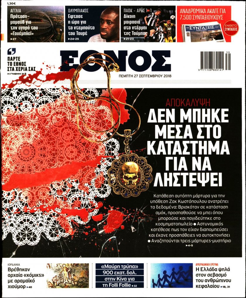 Στο μεταξύ, με πρωτοσέλιδό του ρεπορτάζ το «Εθνος» της Πέμπτης, υποστηρίζει με βεβαιότητα ότι ο Ζακ Κωστόπουλος δεν είχε μπει στο κοσμηματοπωλείο το μοιραίο απόγευμα με σκοπό τη ληστεία.