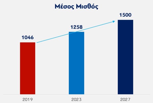 Ο μέσος μισθός από 1046 ευρώ το 2019 και 1258 ευρώ στο τέλος του 2023 προβλέπεται να φθάσει το 2027 στα 1500 ευρώ.
