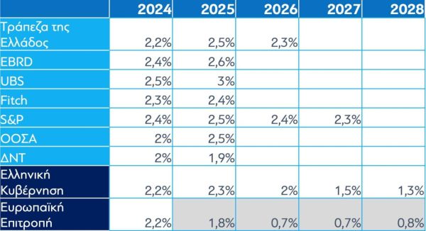 Η πρόβλεψη για την ανάπτυξη που περιλαμβάνεται στο μεσοπρόθεσμο είναι συντηρητική, διότι θέλουμε να είμαστε απολύτως ευθυγραμμισμένοι με την ΕΕ. Πρόκειται ουσιαστικά για ένα μηχανισμό προβολής με βάση ιστορικά στοιχεία, χωρίς να λαμβάνονται υπόψη οι πραγματικές δυνατότητες της οικονομίας. Σημειώνεται ότι η Τράπεζα της Ελλάδος όπως και μια σειρά από διεθνείς οργανισμούς προβλέπουν υψηλότερους ρυθμούς ανάπτυξης. Παρ’ όλα αυτά το μεσοπρόθεσμο προβλέπει ανάπτυξη 2,3% το 2025, 2% το 2026, 1,5% το 2027 και 1,3% το 2028, ρυθμοί που είναι από τους υψηλότερους στην ΕΕ. Με βάση αυτές τις συντηρητικές προβλέψεις, το ονομαστικό ΑΕΠ αναμένεται να αυξηθεί από 232 δισ. ευρώ  το 2024 σε 272 δισ. το 2028.