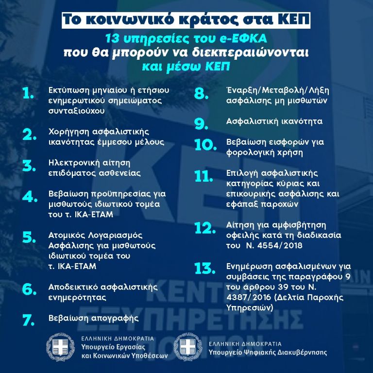 Πιο συγκεκριμένα, όσον αφορά στον e-ΕΦΚΑ, θα μπορούν να διεκπεραιώνονται και μέσω των ΚΕΠ αιτήματα πολιτών για τις εξής ηλεκτρονικές διαδικασίες: