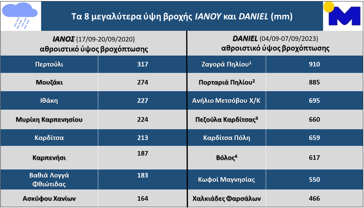 Ενδεικτικά αναφέρουμε ότι το μεγαλύτερο ύψος βροχόπτωσης κατά την κακοκαιρία Ιανός ήταν 317 mm στο Περτούλι, ενώ κατά την κακοκαιρία Daniel ήταν 910 mm στη Ζαγορά Πηλίου.
