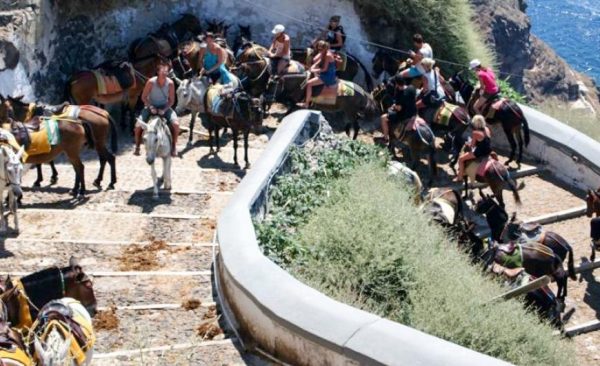 Τα γαϊδούρια μένουν ώρες στον καυτό ήλιο και καλούνται να μεταφέρουν εκατοντάδες ή και χιλιάδες τουρίστες κάθε ημέρα από το παλιό λιμάνι των Φηρών, στην κορυφή της καλντέρας (απόσταση 400 μέτρων με 600 σκαλιά) και πίσω, καθώς το τελεφερίκ δεν αρκεί για τόσο κόσμο. Τα ζώα υποφέρουν από τραυματισμούς στη σπονδυλική στήλη, πληγές από τη σέλα και εξάντληση από το βάρος που κουβαλούν. Ηδη, πρόσφατη νομοθεσία απαγορεύει τη μεταφορά βάρους άνω των 100 κιλών από ένα ζώο.