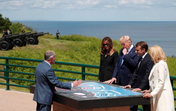 O αμερικανός πρόεδρος απέφυγε αναφορές σε θέματα τριβής μεταξύ της διακυβέρνησής του και της Ευρώπης, μάλιστα αγκαλιάστηκε θερμά με τον Μακρόν φθάνοντας στο αμερικανικό στρατιωτικό νεκροταφείο της Νορμανδίας, σε μια περιοχή κοντά στην παραλία όπου 2.500 αμερικανοί στρατιώτες σκοτώθηκαν από γερμανικά πυρά στις 6 Ιουνίου 1944, κατά την πρώτη ημέρα της συμμαχικής επιχείρησης.