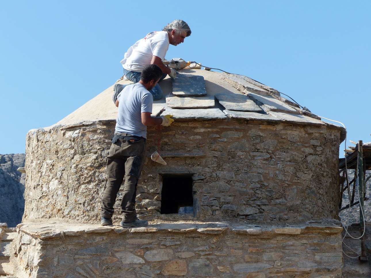 «Δεν θέλαμε να παραδώσουμε μία εκκλησία καινούργια, που να λάμπει, αλλά να διατηρήσουμε την εικόνα ενός ναού τόσων αιώνων, μέσα σε ένα παρθένο τοπίο», ήταν η εξήγηση της προσέγγισης από τον άρτι εκλεγέντα στη Σχολή Αρχιτεκτόνων Μηχανικών, επίκουρο καθηγητή Κλήμη Ασλανίδη, που μαζί με τον πρωτεργάτη του έργου Γιάννη Κίζη και την Χριστίνα Πινάτση, ανέλαβαν την «σωτηρία» της Αγίας Κυριακής (2013-2014). Προτού οι συντηρητές της Εφορείας Αρχαιοτήτων Κυκλάδων, υπό την εποπτεία της 2ας Εφορείας Βυζαντινών Αρχαιοτήτων, αναλάβουν να σώσουν και τον σπάνιο σε έκταση ανεικονικό διάκοσμο του ερημικού ναΐσκου (2015-2016). Με την πολύτιμη συνδρομή της Ελληνικής Εταιρείας Περιβάλλοντος και Πολιτισμού (ΕΛΛΕΤ), η οποία συνέβαλε στο πιο καθοριστικό ίσως: στην προσέλκυση χορηγιών – από το Ίδρυμα Ι. Φ. Κωστοπούλου, το Ίδρυμα Α. Γ. Λεβέντη, την Μαρίνα και τον Θανάση Μαρτίνο.