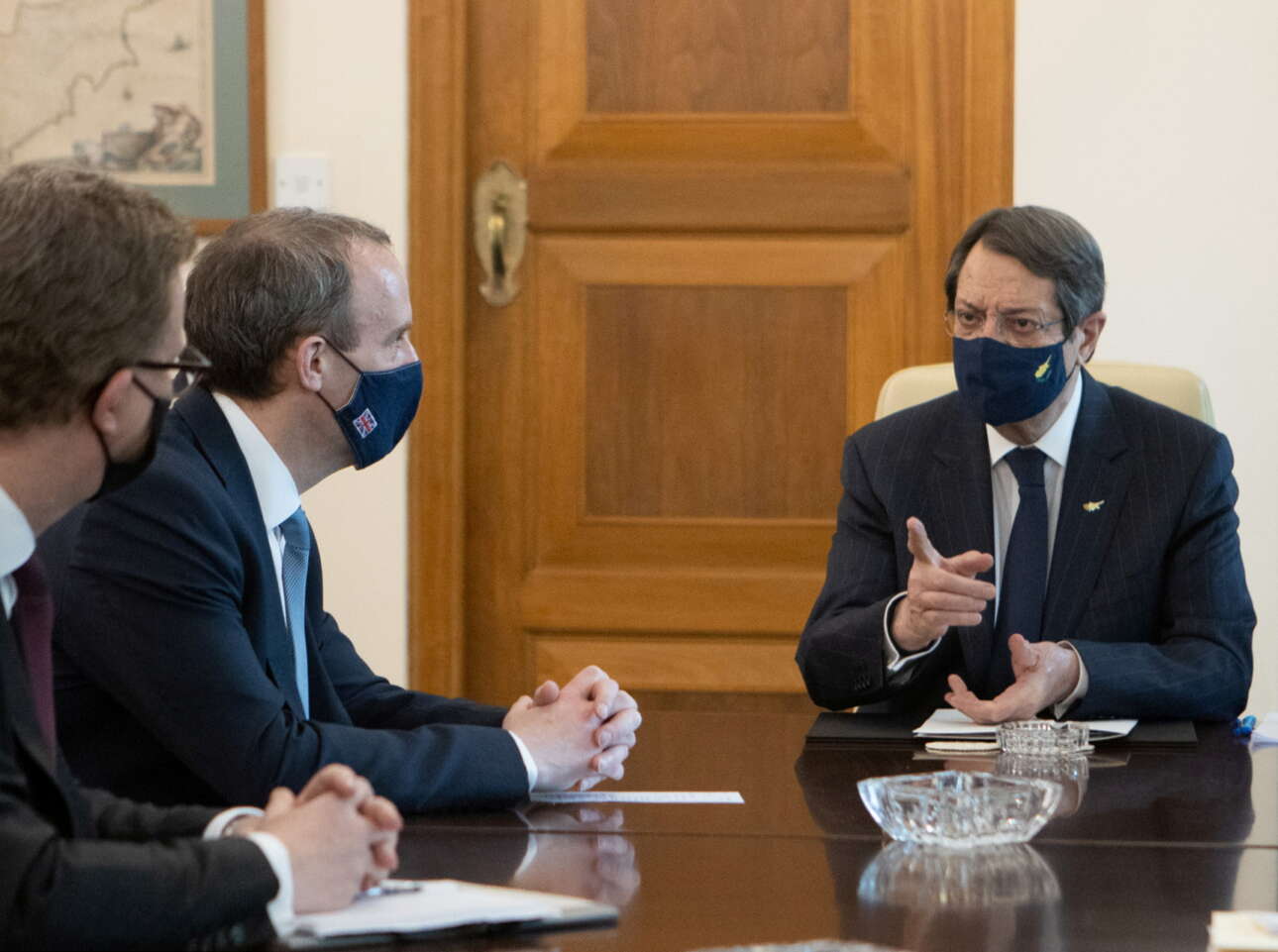 Ο Ντομινίκ Ράαμπ, ο οποίος νωρίτερα είχε συνάντηση με τον Πρόεδρο της Κυπριακής Δημοκρατίας Νίκο Αναστασιάδη σημείωσε ότι η Βρετανία επιθυμεί να δει «μόνιμο τέλος της διένεξης στην Κύπρο και ευελπιστώ ότι όλες οι πλευρές θα δουν τις ευκαιρίες που παρουσιάζονται», ενώ καταλήγοντας μίλησε για περιφερειακή σταθερότητα στην οποία θα συμβάλλει η λύση του Κυπριακού.
