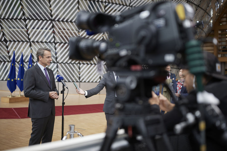 Ο Πρωθυπουργός Κυριάκος Μητσοτάκης ενώ κάνει δηλώσεις στους δημοσιογράφους, μετά την ολοκλήρωση των εργασιών της Συνόδου του Ευρωπαϊκού Συμβουλίου στις Βρυξέλλες | ΑΠΕ-ΜΠΕ/ΓΡΑΦΕΙΟ ΤΥΠΟΥ ΠΡΩΘΥΠΟΥΡΓΟΥ/ΔΗΜΗΤΡΗΣ ΠΑΠΑΜΗΤΣΟΣ