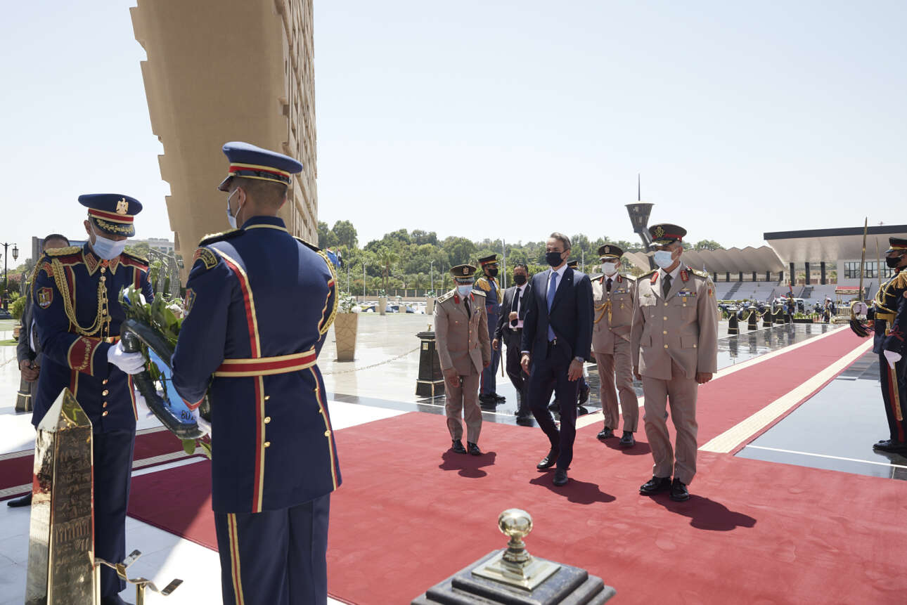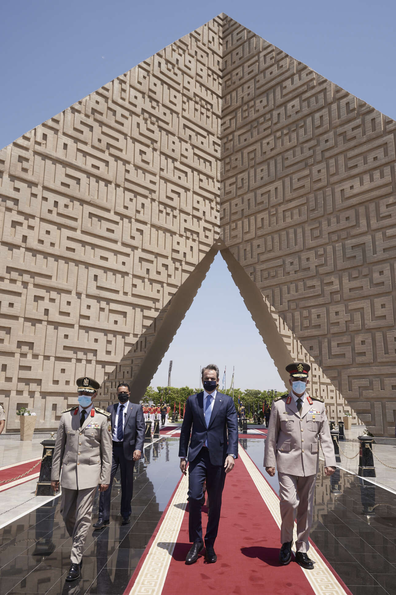 Στη συνέχεια, ο Πρωθυπουργός μετέβη στο Μνημείο του Αγνώστου Στρατιώτη, όπου κατέθεσε δύο στεφάνια, ένα στο Μνημείο του Αγνώστου Στρατιώτη και ένα στον τάφο του Προέδρου Ανουάρ Σαντάτ.