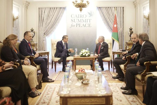 Ο Κυριάκος Μητσοτάκης συναντήθηκε στο περιθώριο της «Συνόδου Κορυφής για την Ειρήνη» στο Κάιρο, με τον βασιλιά της Ιορδανίας Αμπντάλα II και συζήτησαν τις τελευταίες εξελίξεις στη Μέση Ανατολή, με έμφαση την προστασία των αμάχων στη Λωρίδα της Γάζας και την ανάγκη αποφυγής ανθρωπιστικής κρίσης.
