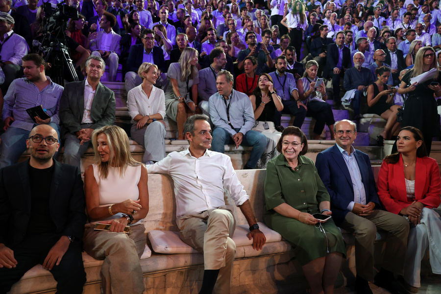 Στην αρχή της συζήτησης, ο Κυριάκος Μητσοτάκης με αρκετή δόση χιούμορ σχολίασε με ενθουσιασμό το γεγονός ότι ήταν κατάμεστο το Ηρώδειο, παρότι όπως επεσήμανε, σε 45 λεπτά αναμενόταν να ξεκινούσε η μάχη του Γιάννη Αντετοκούνμπο και όλων προφανώς των μελών της Εθνικής ομάδας μπάσκετ κόντρα στην Τουρκία.