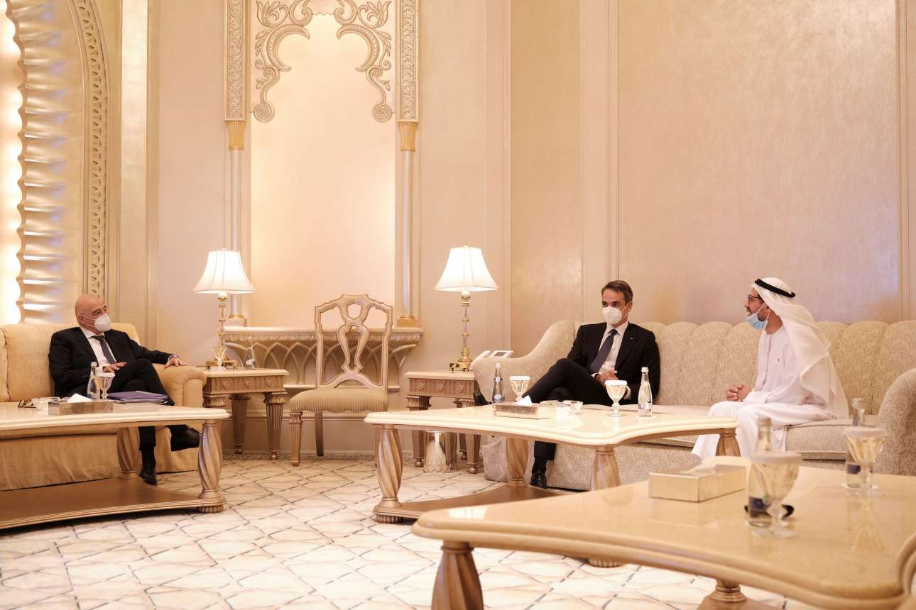 Την ενίσχυση και αναβάθμιση των διμερών σχέσεων σε στρατηγικό επίπεδο επισφράγισε η συνάντηση του Πρωθυπουργού Κυριάκου Μητσοτάκη και της ελληνικής αντιπροσωπείας με τον διάδοχο του θρόνου των Ηνωμένων Αραβικών Εμιράτων, σεΐχη Μοχάμεντ μπιν Ζαγιέντ αλ Ναϊάν (Mohammed Bin Zayed Al Nahyan) και την αποστολή των ΗΑΕ.