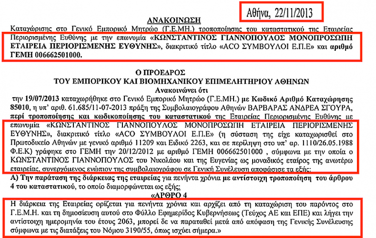 Από έγγραφα που παρουσιάζει «Το Βήμα» ο κ. Γιαννόπουλος είχε ζητήσει στις 22 Νοεμβρίου 2013 η εν λόγω «κρυφή» εταιρεία συμβούλων που είχε δημιουργήσει από το 1988, να παρατείνει τη λειτουργία της για 50 χρόνια, δηλαδή μέχρι το 2063!