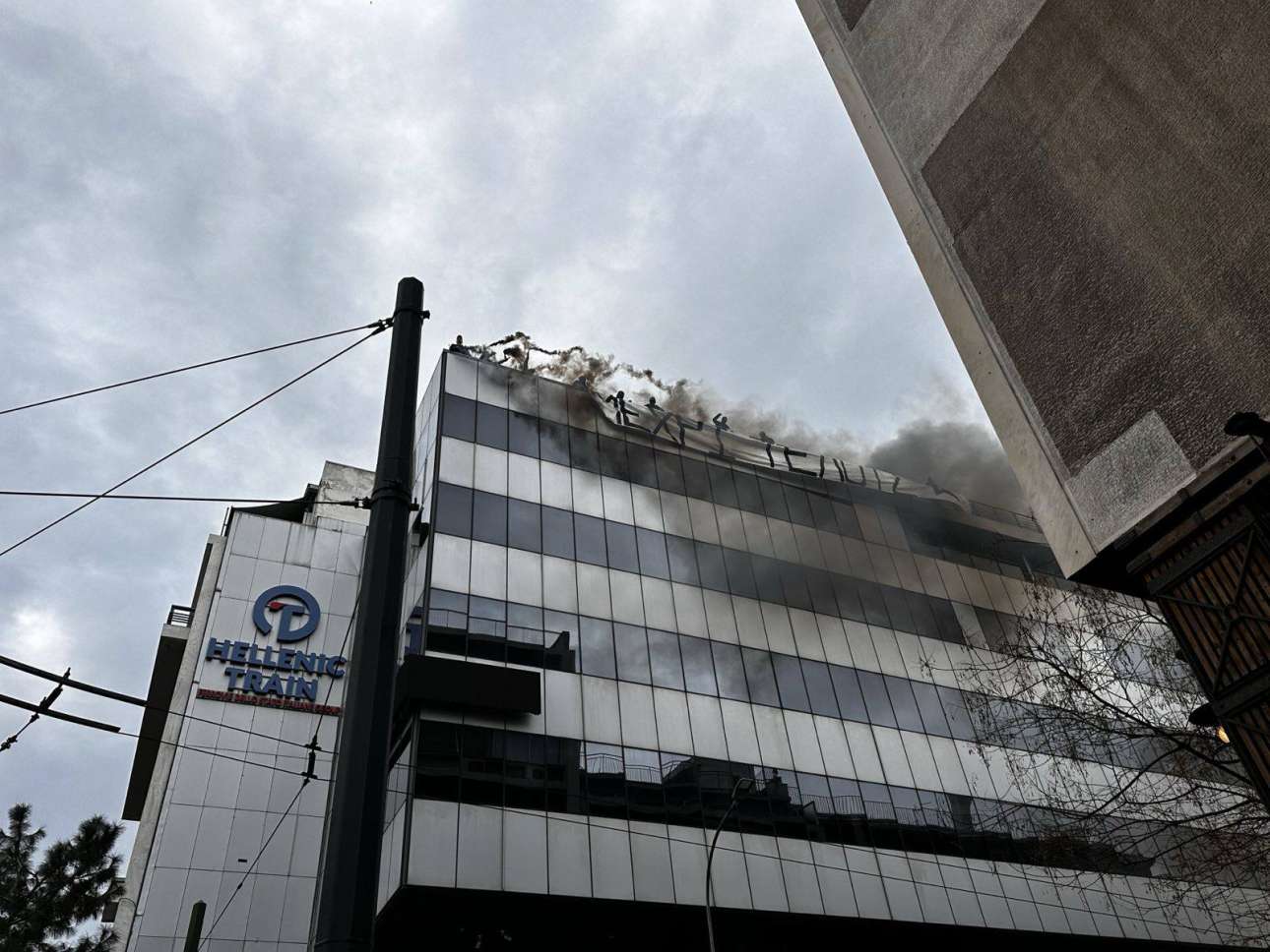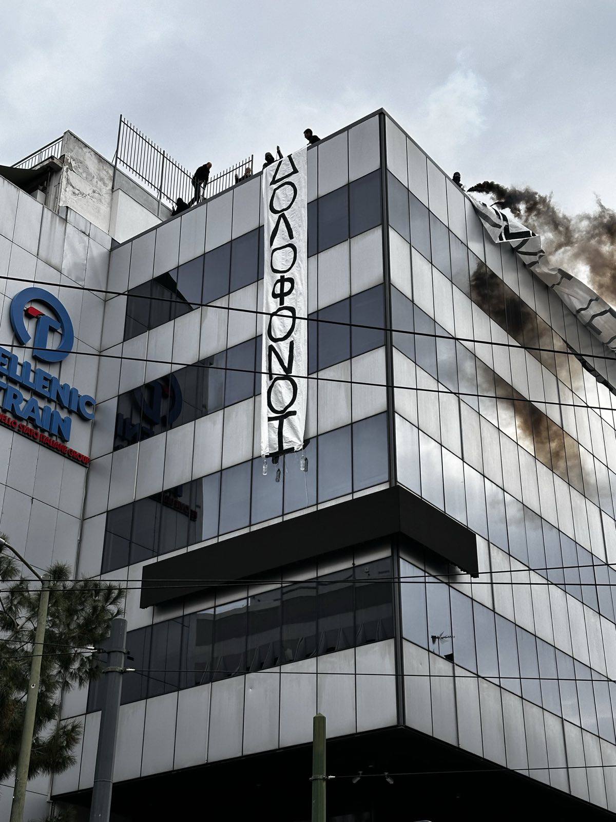 Μέλη του «Ρουβίκωνα» ανέβηκαν στην ταράτσα του κτιρίου των γραφείων της Hellenic Train από όπου ανήρτησαν πανό με το σύνθημα «Μέχρι τέλους». και «Δολοφόνοι»