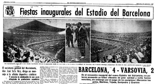 Το Καμπ Νου άρχισε να κατασκευάζεται το 1954 και ολοκληρώθηκε τον Σεπτέμβριο του 1957. Ηταν ένα υπερσύγχρονο και τεράστιο σε χωρητικότητα στάδιο. Τα εγκαίνια έγιναν στις 24 Σεπτεμβρίου του 1957 μπροστά σε 93.053 θεατές με έναν φιλικό αγώνα ανάμεσα στην Μπαρσελόνα και την μικτή Βαρσοβίας με τελικό σκορ 4-2 υπέρ των γηπεδούχων.