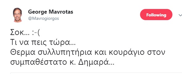 Θερμά συλλυπητήρια στην οικογένεια του Γιώργου Δημαρά.— Vassilis Kikilias (@Vkikilias) September 7, 2018