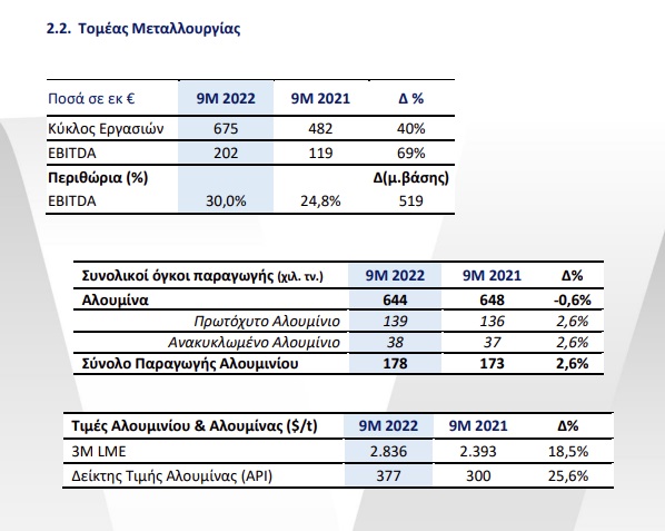 O κύκλος εργασιών διαμορφώθηκε σε €4.573 εκατ. έναντι €1.698 εκατ. στο Εννεάμηνο του 2021, σημειώνοντας αύξηση 169%. Τα Κέρδη προ Φόρων, Τόκων και Αποσβέσεων (EBITDA) αυξήθηκαν κατά 121% στα €533 εκατ. έναντι €241 εκατ. την αντίστοιχη περίοδο του προηγούμενου έτους, επωφελούμενα από τις ιστορικά υψηλές επιδόσεις των δραστηριοτήτων σε μεταλλουργία και «πράσινη» ενέργεια.