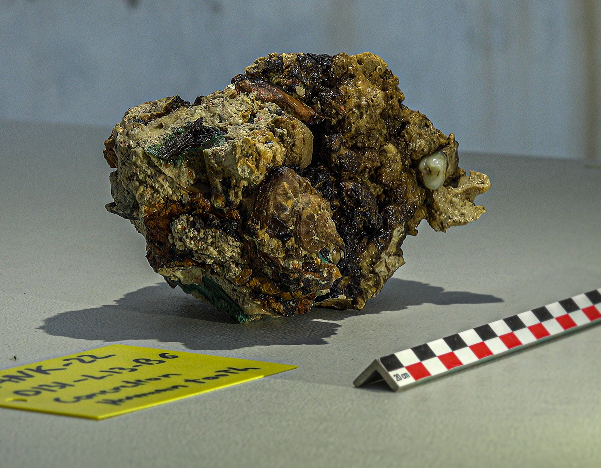 • Η μεγάλη έκπληξη έρχεται από τη ανεύρεση δύο ανθρώπινων δοντιών πάνω σε συμπαγές συσσωμάτωμα με ίχνη χαλκού, το οποίο δια του γενετικού υλικού του θα βοηθήσει στο προσδιορισμό του φύλου και άλλων γενετικών χαρακτηριστικών του ανθρώπου στον οποίο ανήκαν.
