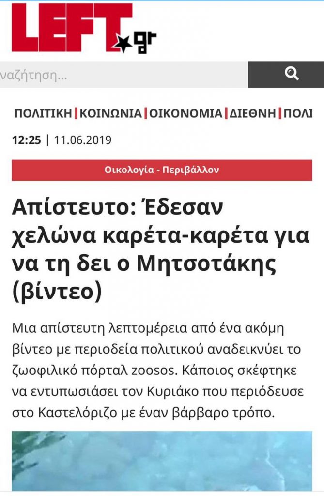 Κατά τα άλλα ειλικρινά απορώ για την ευκολία με την οποία υιοθετήσατε -διότι δεν θέλω να πιστεύω ότι κατασκευάσατε- μια τόσο εξωφρενική ιστορία. Διότι εξωφρενικό θα ήταν βέβαια κάποιος να δέσει μια χελώνα στο λιμάνι για να την δει ο αρχηγός της αξιωματικής αντιπολίτευσης, χωρίς να γνωρίσει την άμεση κατακραυγή όχι μόνον του ίδιου του κ. Μητσοτάκη, αλλά και όλων των κατοίκων του Καστελόριζου που φροντίζουν τις λίγες καρέτα-καρέτα που υπάρχουν στο νησί.