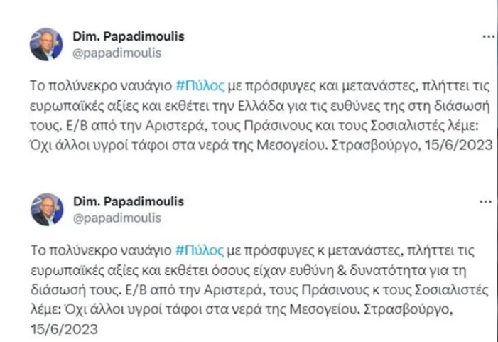 Η ανάρτηση συνοδευόταν από φωτογραφία του κ. Παπαδημούλη μαζί με άλλους συναδέλφους του στην Ευρωβουλή -ανάμεσά τους η Ελενα Κουντουρά και ο πάντα έτοιμος για θέματα που εφάπτονται του Μεταναστευτικού (βλ. νεκρή Μαρία στον Εβρο) Κώστας Αρβανίτης- κρατώντας στα χέρια αφίσες με συνθήματα όπως: «όχι άλλοι θάνατοι. Οι ζωές των προσφύγων έχουν αξία» – «η Ευρώπη-φρούριο σκοτώνει», «είναι έγκλημα όχι ατύχημα».