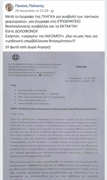 Ο λόγος, φυσικά, για τον Παύλο Πολάκη ο οποίος σε ανάρτησή του στις 29 Νοεμβρίου του 2021, επικαλούμενος έγγραφο της επίσης βουλευτού του ΣΥΡΙΖΑ Δώρας Αυγέρη για αναβολή έκτακτων χειρουργείων στη Θεσσαλονίκη, είχε γράψει με το γνωστό του ύφος: «Είστε δολοφόνοι! Σκέρτσο, “γκρέμλιν του Μαξίμου” έλα να μας πεις για μηδενική υπερβάλλουσα θνησιμότητα».
