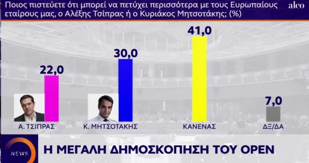 Στο ερώτημα «ποιος πιστεύετε ότι μπορεί να πετύχει περισσότερα με τους ευρωπαίους εταίρους, ο Τσίπρας ή ο Μητσοτάκης;», το 30% λέει ο Μητσοτάκης, 22% απαντά ο Τσίπρας και 41% εκτιμά ο… «κανένας».