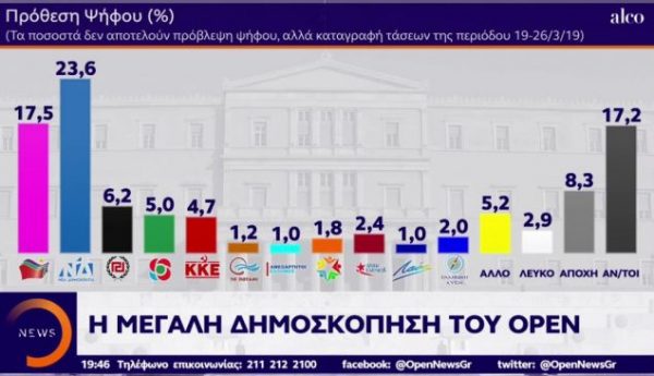 Ακόμα μία δημοσκόπηση, αυτήν τη φορά της Alco που παρουσιάστηκε στο κεντρικό δελτίο ειδήσεων του Open TV, καταγράφει σταθερό και ευρύ προβάδισμα της ΝΔ έναντι του ΣΥΡΙΖΑ.