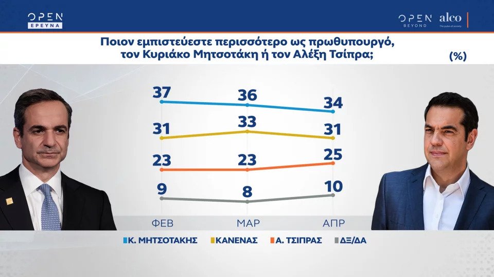 Τον Φεβρουάριο η διαφορά ήταν 14 μονάδες (37% Μητσοτάκης και 23% Τσίπρας) ενώ τον Απρίλιο η διαφορά έπεσε στις 9 μονάδες (34% έναντι 25%). Ο «κανένας» παραμένει στα ίδια επίπεδα και στο 31%.