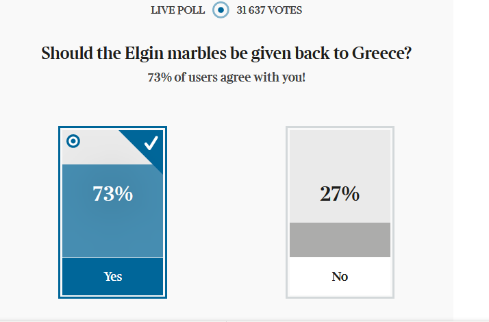 Διαδικτυακή δημοσκόπηση που διενεργούν οι Times με αφορμή τις νέες δηλώσεις Οσμπορν δείχνει πως το 73% των άνω των 31.000 αναγνωστών που έχουν ψηφίσει θέλουν την επιστροφή των Ελγίνειων στην Ελλάδα.