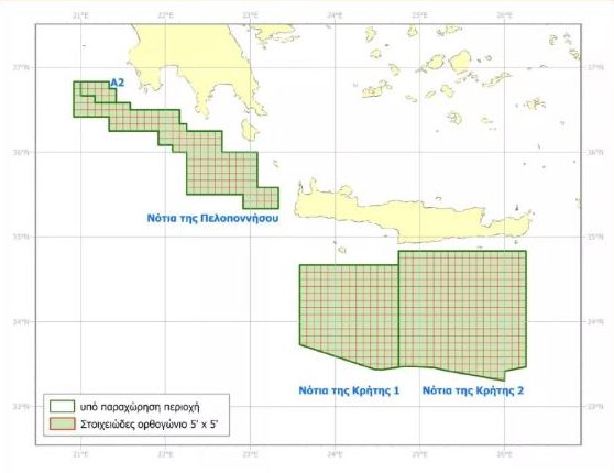Υπεγράφησαν σήμερα από τον υπουργό Περιβάλλοντος και Ενέργειας, κ. Σταύρο Παπασταύρου, τέσσερις Υπουργικές Αποφάσεις, οι οποίες αφορούν στην επιλογή αιτούντων του διεθνούς διαγωνισμού για την παραχώρηση δικαιώματος έρευνας και εκμετάλλευσης υδρογονανθράκων στις θαλάσσιες περιοχές νοτίως της Πελοποννήσου (περιοχές «Α2» και «Νότια της Πελοποννήσου») και στις θαλάσσιες περιοχές νοτίως της Κρήτης (περιοχές «Νότια της Κρήτης 1» και «Νότια της Κρήτης 2»).