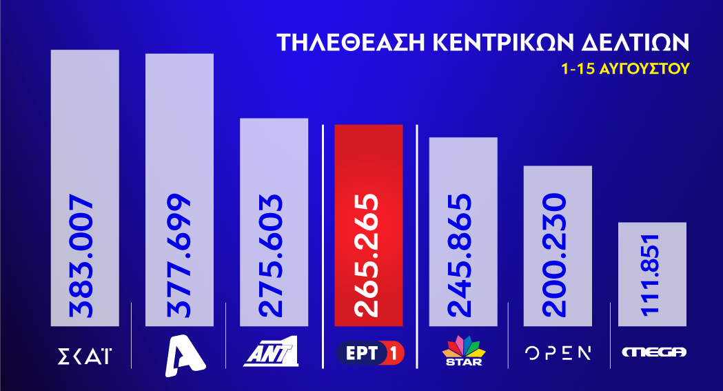 Σύμφωνα, μάλιστα, με τα τελευταία στοιχεία της Nielsen, το διάστημα από 1η έως 15 Αυγούστου, το κεντρικό δελτίο ειδήσεων της ΕΡΤ1, στις 21:00, κατέγραψε μέση τηλεθέαση 11%, καθώς το παρακολουθούν καθημερινά περισσότεροι από 265.000 τηλεθεατές, οι οποίοι επιλέγουν τη δημόσια τηλεόραση για την ενημέρωσή τους.