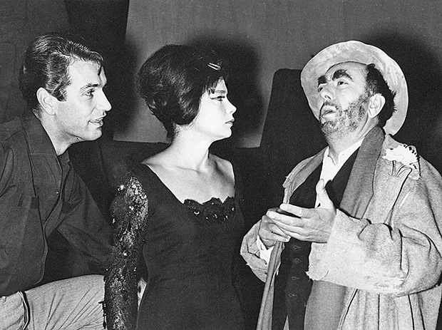 Την επόμενη χρονιά, πάντως, εκείνος έκανε την πρώτη του εμφάνιση, δίπλα στην Έλλη Λαμπέτη και το Δημήτρη Χορν, στην «Κυρία με τις Καμέλιες» του Αλέξανδρου Δουμά. Η δε πρώτη του καλή κριτική ήταν από τον Άγγελο Τερζάκη, όταν έπαιξε με τον θίασο Βεργή. Και οκτώ χρόνια αργότερα, το 1967, ήταν υποψήφιος για βραβείο Τόνι, μαζί με την Μελίνα Μερκούρη, τον Μάνο Χατζιδάκι και την παραγωγή, χάρη στη μεταγραφή για το Μπρόντγουεϊ της ταινίας «Ποτέ την Κυριακή» σε μιούζικαλ ως «Ίλια Ντάρλινγκ», σε σκηνοθεσία Ζυλ Ντασσέν. Στην σημαδιακή – έναν ακριβώς χρόνο μετά το πραξικόπημα των Συνταγματαρχών, στις 21 Απριλίου 1968, απονομή των Τόνι τελικά καμία από τις τέσσερις υποψηφιότητες δεν απέφερε τελικά βραβείο.